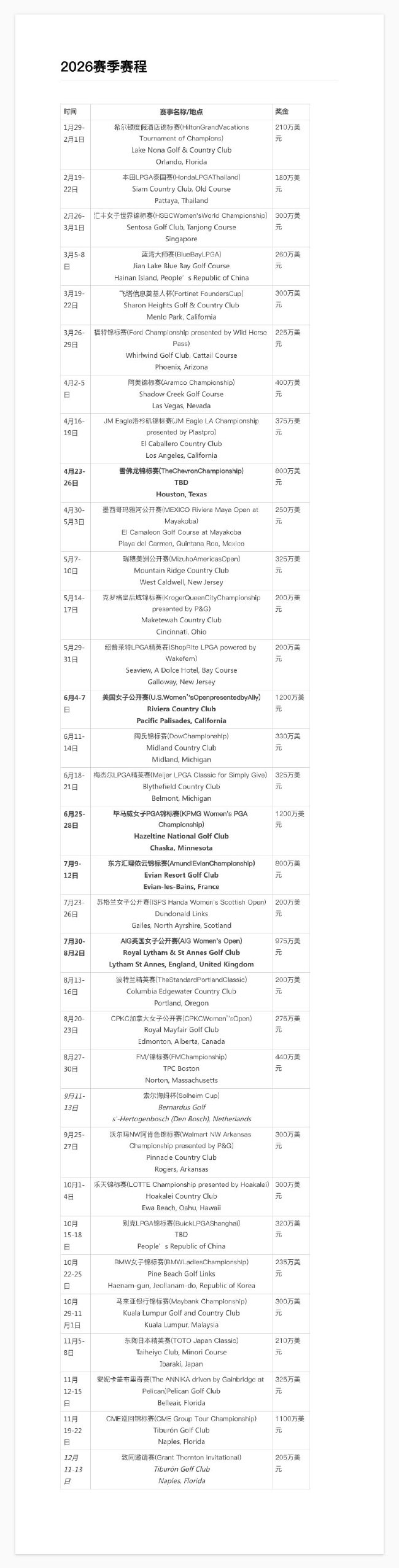 2026赛季,之后到了9月,目前有12项赛事宣布提高奖金,总奖金超过1.32亿美元,会在荷兰举办索尔海姆杯。总奖金260万美元;第二场为别克LPGA锦标赛,将在英格兰举行。会在墨西哥和加拿大两个国家办赛。更流畅的赛程安排以及更多机会,
